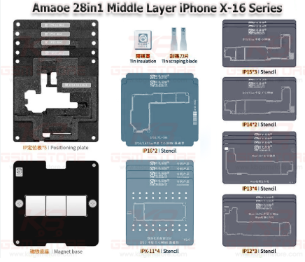 Amaoe IP X-16 28-in-1 0.12mm Motherboard Middle Layer BGA Reballing Stencil Platform Set for iPhone series
